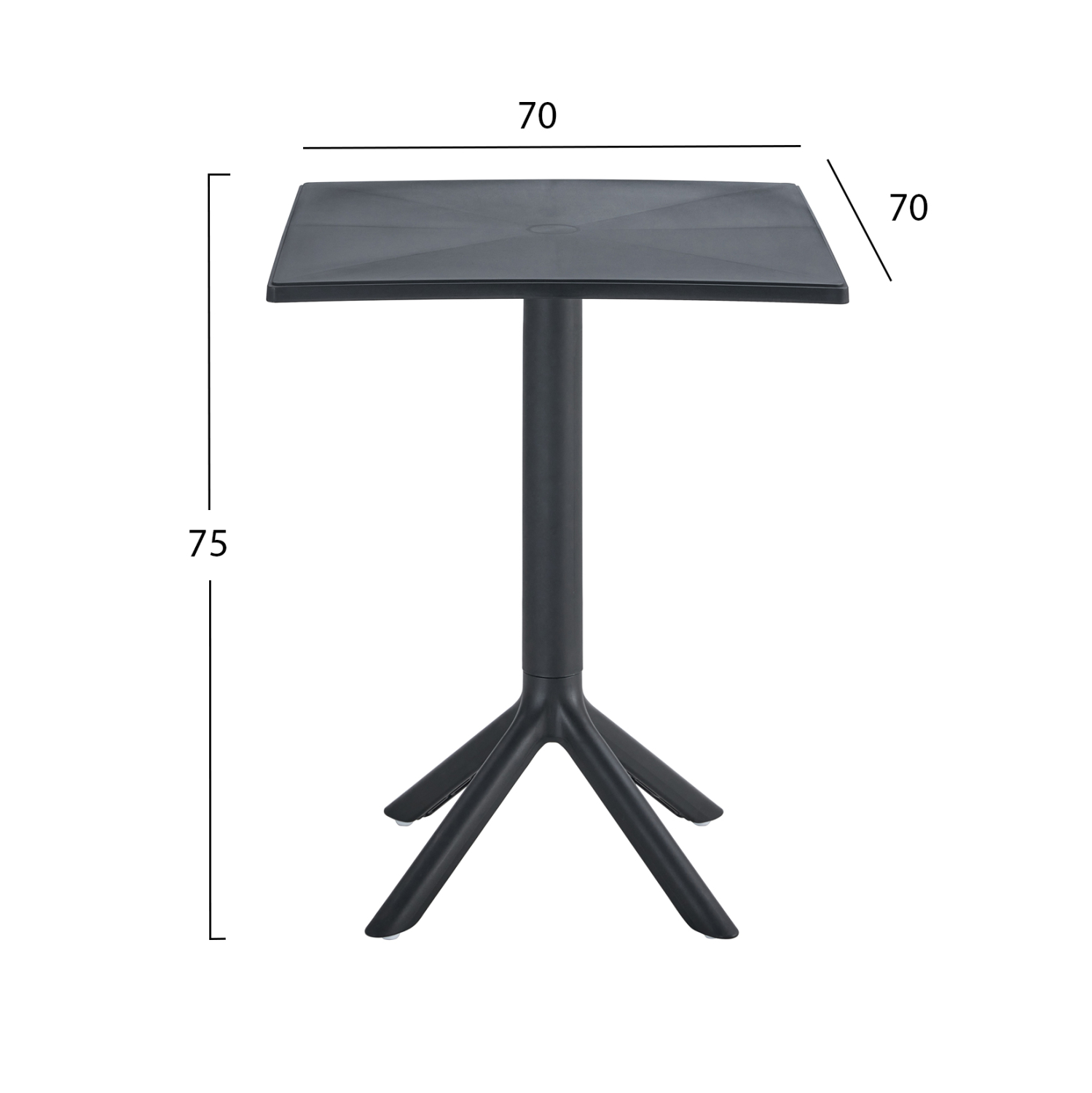 Το τραπέζι πολυπροπυλενίου TERRIN σε ΜΑΥΡΟ χρώμα είναι η ιδανική πρόταση για χρήση σε εξωτερικούς χώρους, είτε επαγγελματικούς (χώροι δεξιώσεων, εταιρείες catering, κλπ.) είτε για το σπίτι. Το τραπέζι είναι τετράγωνο, ενώ η στήριξη γίνεται με μια κολώνα στο κέντρο που καταλήγει σε 4 πόδια («νύχια»).