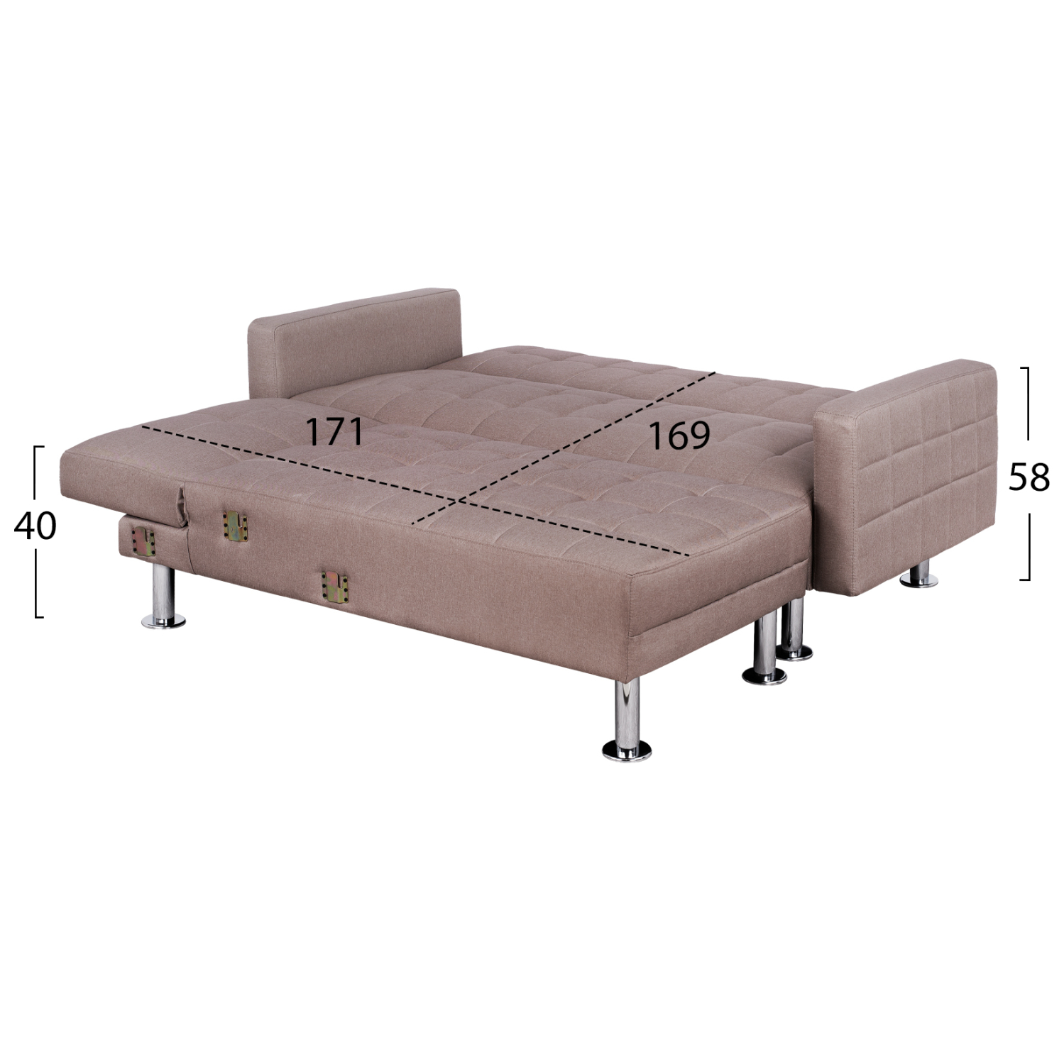 Τριθέσιος καναπές κρεβάτι, με συρόμενο μηχανισμό ανάκλησης κρεβατιού. Διαθέτει δύο διαφορετικά στρώματα και μπορεί να χωριστεί σε δύο μονά κρεβάτια.