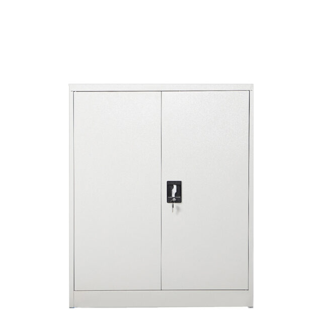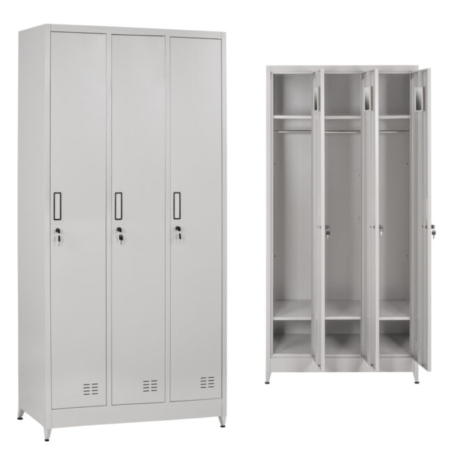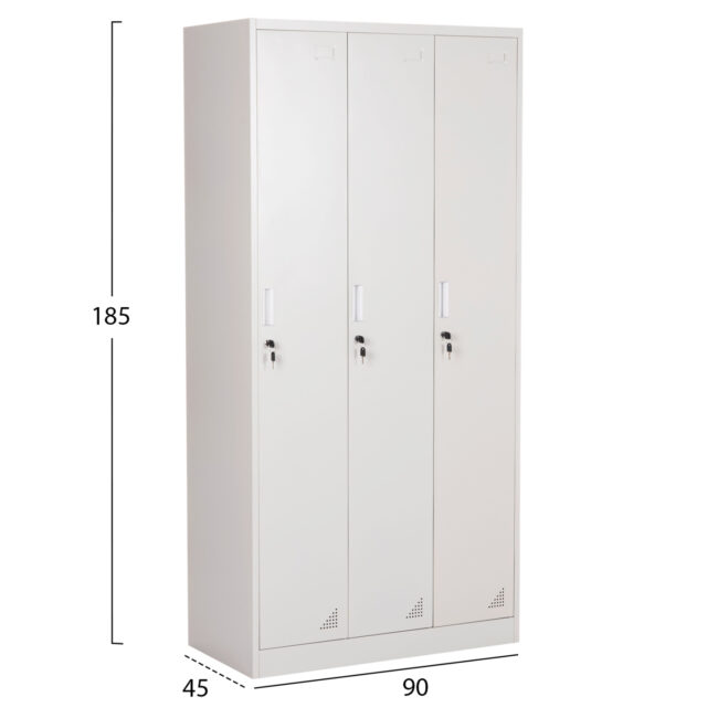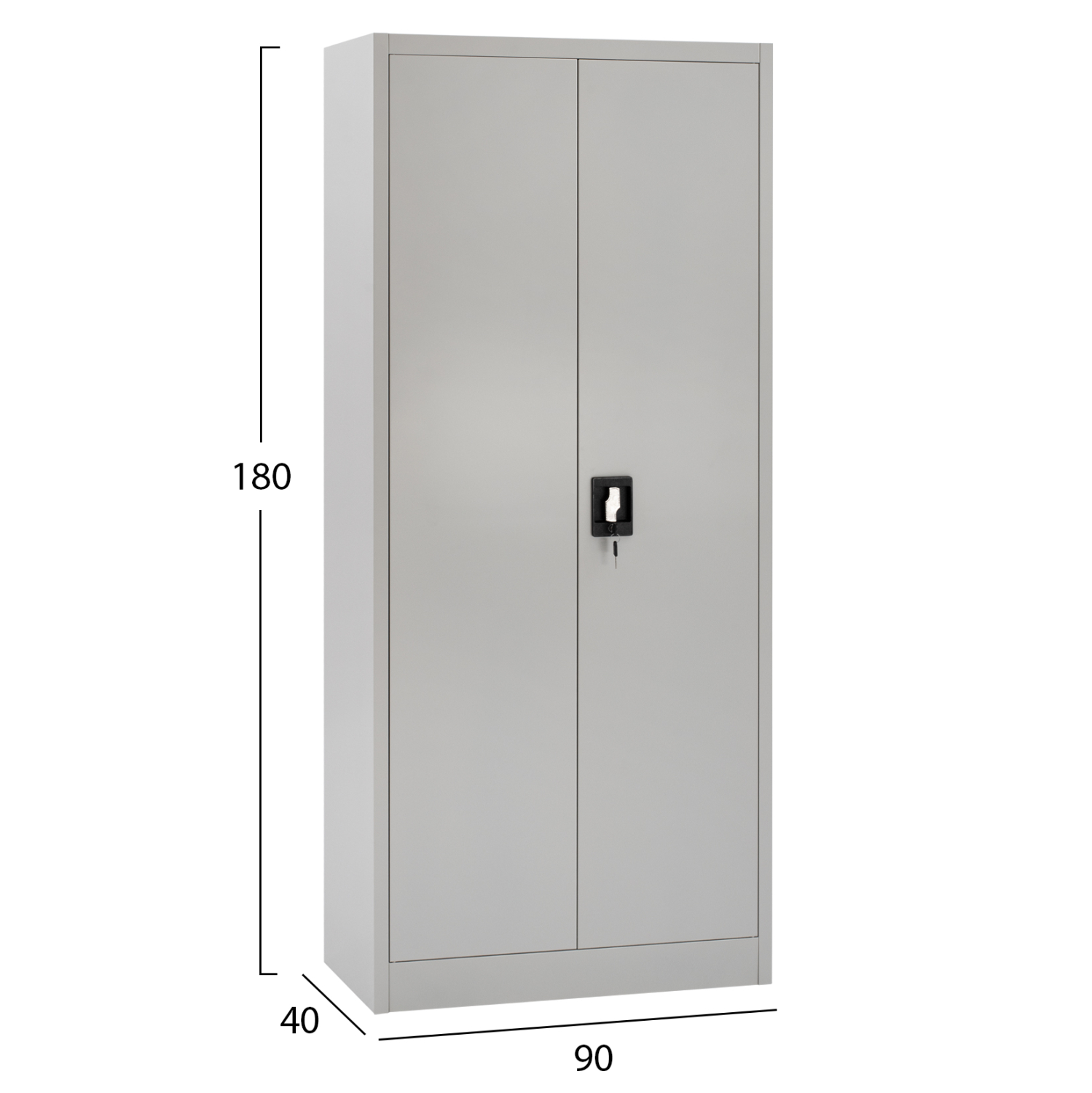 Η ΗΜ5961.01 είναι μια πρακτικότατη μεταλλική ντουλάπα που έχει φτιαχτεί με γνώμονα την χωρητικότητα και την ανθεκτικότητα. Είναι δίφυλλη με τις δύο πόρτες να κλείνουν ακριβώς στην μέση της κατασκευής, ενώ το εσωτερικό είναι χωρισμένο σε 3 κύριους χώρους με μεταλλικό χώρισμα σε σχήμα Τ. Το επάνω μέρος είναι ενιαίο σαν παταράκι, ενώ η μία πλευρά διαθέτει μεταλλική μπάρα για κρέμαση αντικειμένων και η άλλη διαθέτει 2 ράφια που δημιουργούν 3 επίπεδα αποθήκευσης. Οι πόρτες διαθέτουν κλειδαριά που κλειδώνει με κλειδί, ενώ το χρώμα της ντουλάπας είναι πολύ ανοιχτό γκρι.