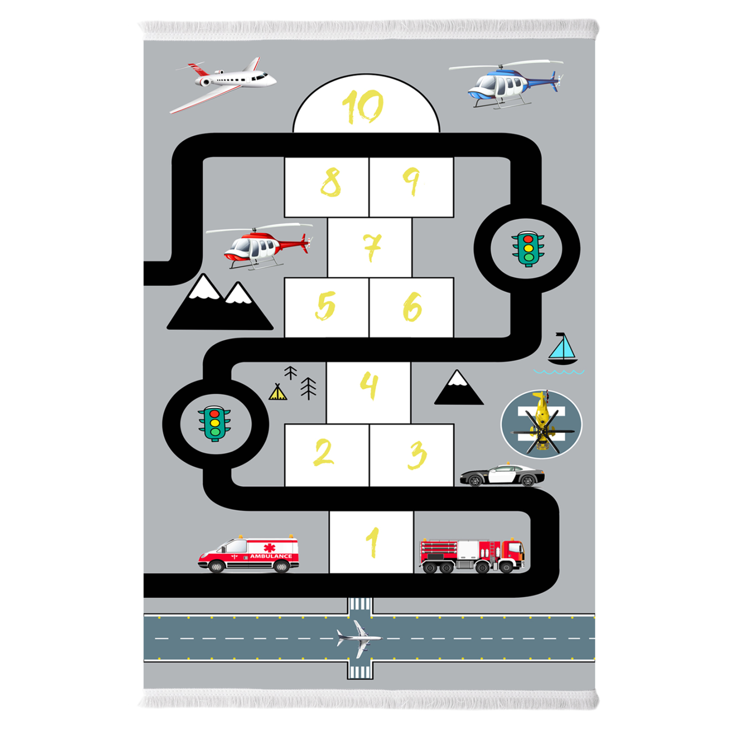 Αυτό το όμορφο χαλί (κυρίως για αγόρια) έχει κυρίαρχο χρώμα το γκρι σε όλη την επιφάνεια του χαλιού, και δεν διαθέτει μπορντούρα. Το σχέδιο του χαλιού, βέβαια, απεικονίζει με μια ποικιλία χρωμάτων το κλασσικό παιχνίδι «κουτσό» με διάφορα σχέδια και δρόμους τριγύρω. Άλλωστε, γιατί να μην είναι το ίδιο το χαλί… παιχνίδι;