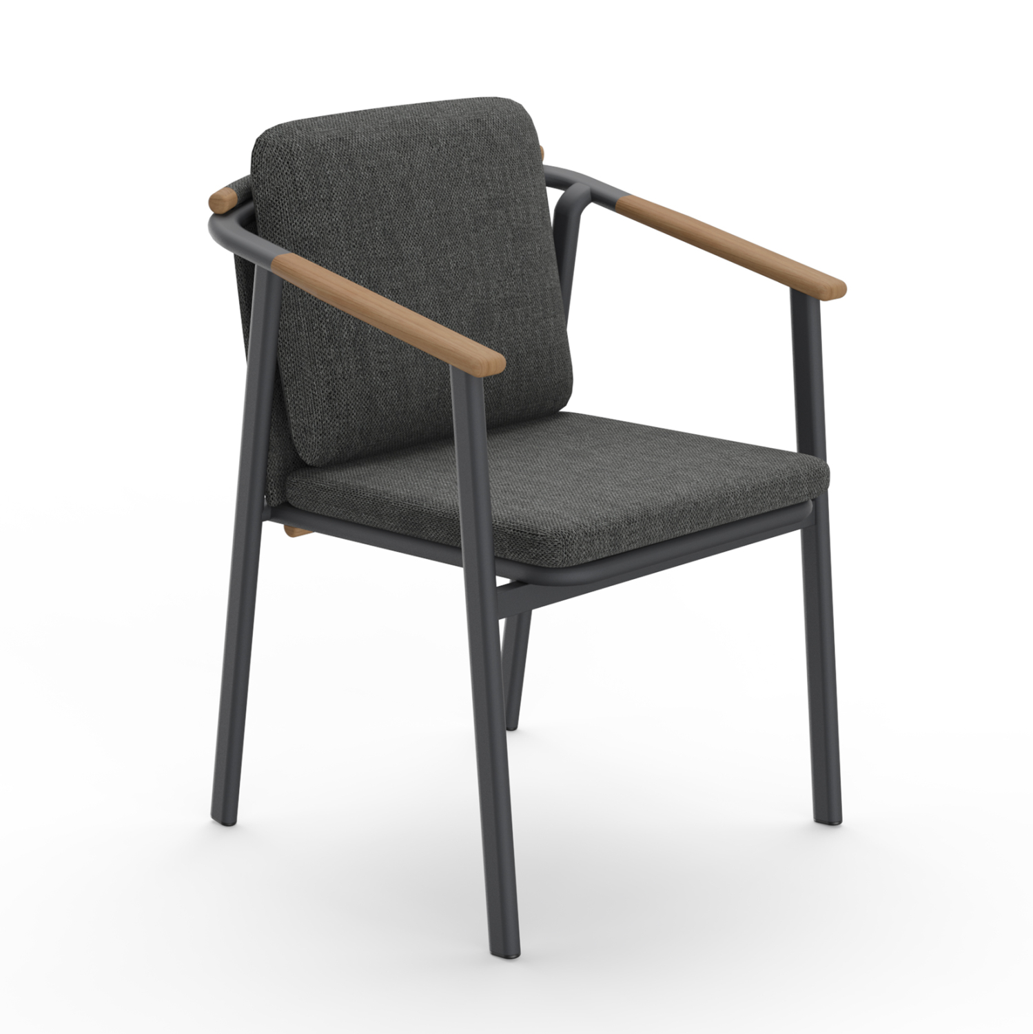 Η πολυθρόνα τραπεζαρίας αλουμινίου SENTI σε ΣΚΟΥΡΟ ΓΚΡΙ χρώμα διαθέτει μαξιλάρια πλάτης και καθίσματος επενδυμένα με ύφασμα OLEFIN, στο ίδιο χρώμα. Η πινελιά με το ξύλο teak στα μπράτσα δίνει μια όμορφη όψη στην πολυθρόνα. Συνδυάστε την με ένα όμορφο τραπέζι και δημιουργήστε μια τραπεζαρία εξωτερικού χώρου που θα κερδίσει τις εντυπώσεις.