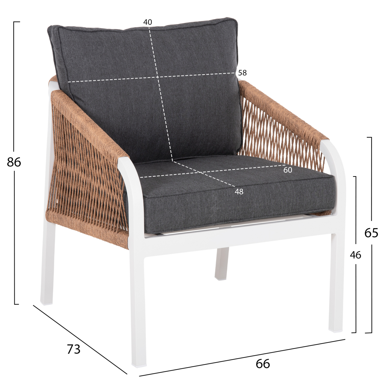 Διαστάσεις πολυθρόνας: 66x73x86Y εκ.–Ύψος καθίσματος: 46 εκ.—Ύψος μπράτσου: 65 εκ.