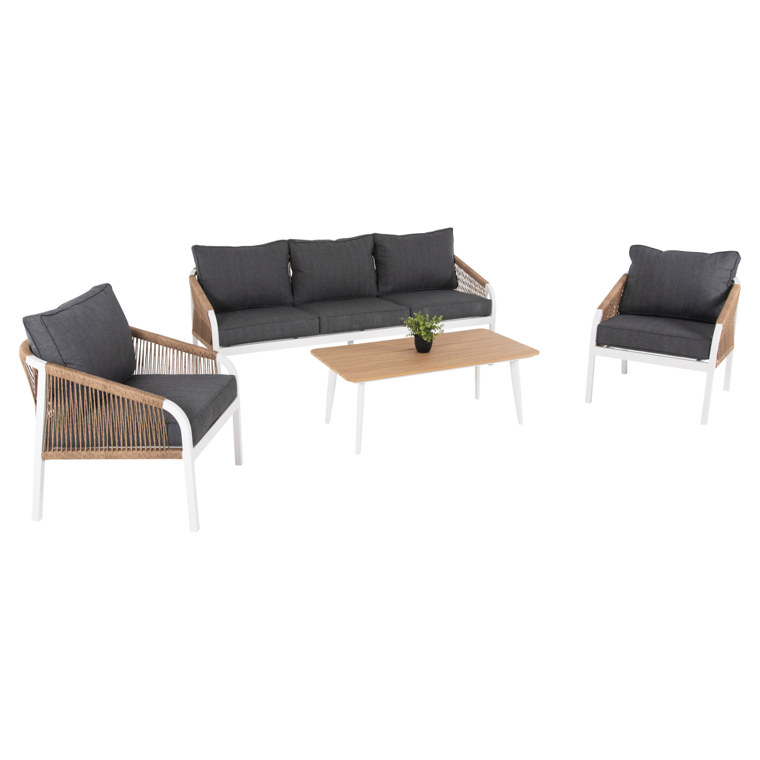 Σας παρουσιάζουμε το εντυπωσιακό και νέο σετ σαλονιού εξωτερικού χώρου MAERLY σε ΛΕΥΚΟ χρώμα, με τραπεζάκι, 2 πολυθρόνες και 1 τριθέσιο καναπέ. Ένα σετ που θα το λατρέψετε με την πρώτη ματιά. Ο σκελετός σε όλο το σετ είναι από αλουμίνιο επενδυμένο με ΜΠΕΖ συνθετικό σχοινί. Το design τους είναι πανέμορφο στην όψη ενώ η στιβαρότητά τους είναι εμφανής. Το κάθισμά στον καναπέ και τις πολυθρόνες είναι φαρδύ ενώ η πλάτη τους αγκαλιάζει το σώμα πράγμα που επιτείνει την άνεση που προσφέρουν, σε συνδυασμό με τα αναπαυτικά μαξιλάρια τόσο στο κάθισμα όσο και στην πλάτη. Ο τριθέσιος καναπές σε παρόμοιο design είναι, όμως, το πιο εντυπωσιακό κομμάτι αυτού του σετ με τις μεγάλες διαστάσεις του που τον καθιστούν το σημείο αναφοράς. Τα μαξιλάρια σε όλο το σετ είναι επενδυμένα με πολυεστερικό ύφασμα σε ΑΝΘΡΑΚΙ χρώμα και διαθέτουν γέμισμα με μέτριας σκληρότητας αφρώδη υλικά για την μεγαλύτερη δυνατή άνεση, αλλά και φερμουάρ. Τι άλλο να ζητήσει κανείς για να αναβαθμίσει τον εξωτερικό χώρο της επιχείρησής του;