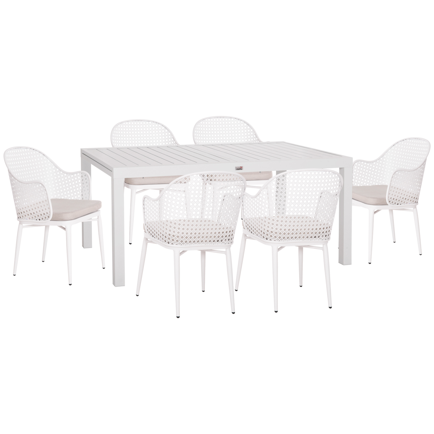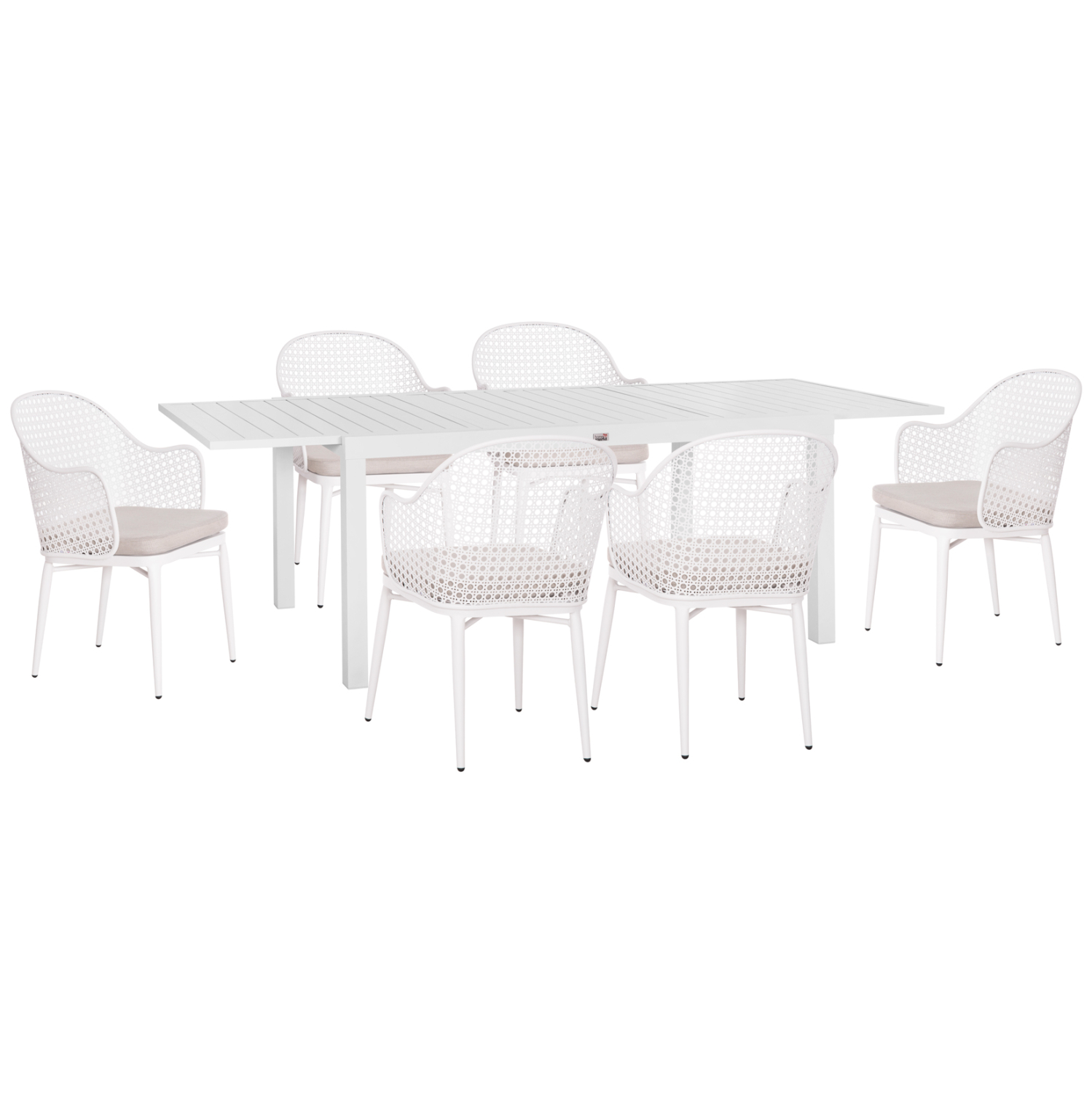Αυτό το σετ τραπεζαρίας εξωτερικού χώρου αποτελείται από ένα ΛΕΥΚΟ επεκτεινόμενο τραπέζι αλουμινίου και 6 ΛΕΥΚΕΣ πολυθρόνες αλουμινίου με ΓΚΡΙ μαξιλάρι καθίσματος.
