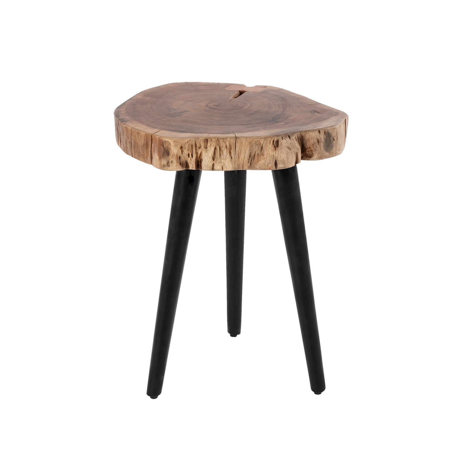 Χειροποίητο τραπέζι σε ακανόνιστο σχήμα επιφάνειας με 3 μαύρα μεταλλικά πόδια σε διάταξη που «ανοίγουν» προς τα κάτω.