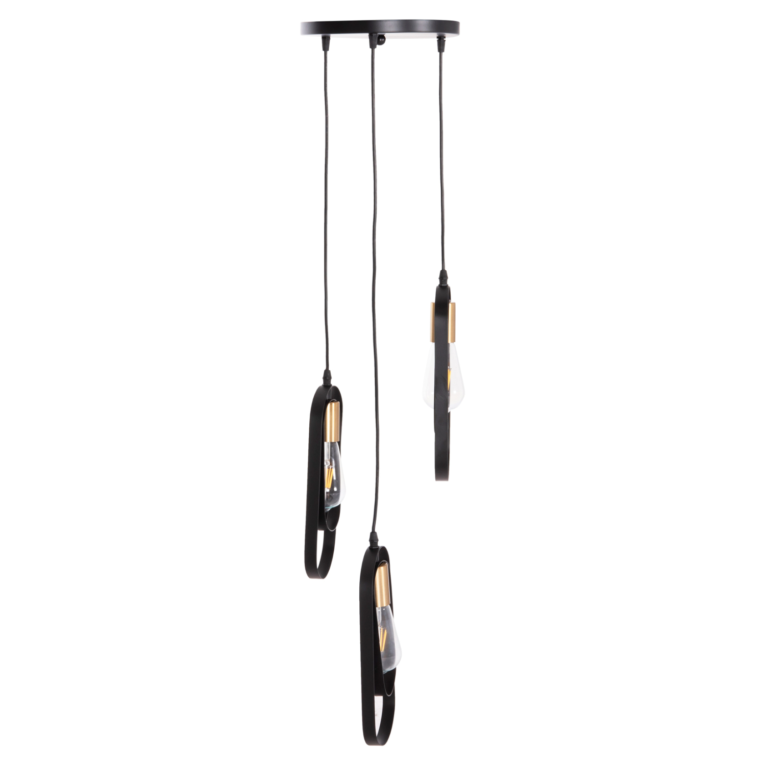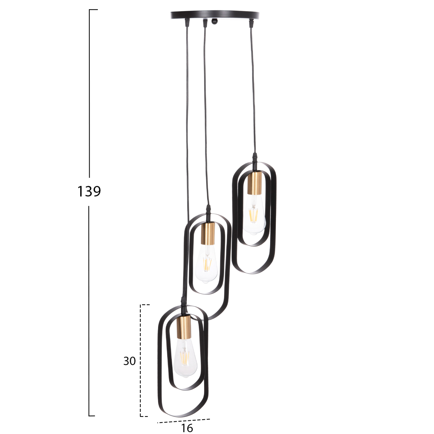 Το κρεμαστό φωτιστικό οροφής BIUT είναι ένα τρίφωτο κρεμαστό σε διαφορετικά ύψη με μαύρη στρογγυλή βάση και μαύρα καλώδια κρέμασης. Οι λάμπες τοποθετούνται σε ντουί χρυσού χρώματος ενώ αυτό που τραβάει τα βλέμματα είναι το minimal design των καπέλων με τα δύο μεταλλικά πλαίσια.